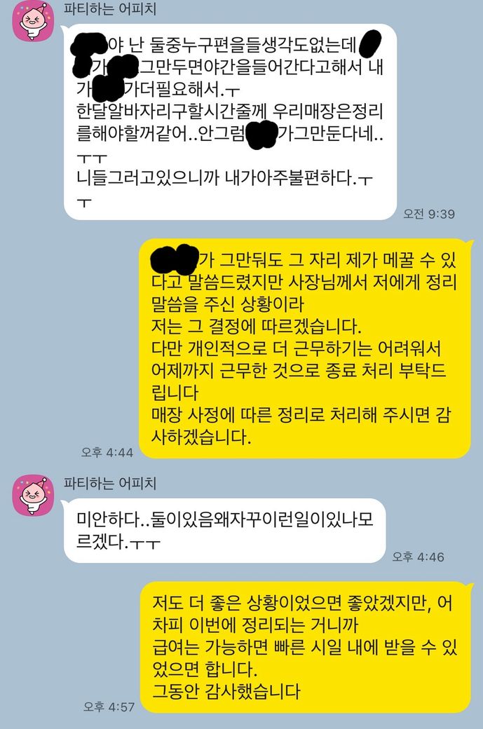 제 입장에서는 그 친구 저보다 일 하는 시간이 길지만 제가 좀 더 오래 다녔었고 곧 9개월 앞둬서 3개월만 더하면 퇴직금 받을 수 있어 계속 일해왔던건데 갑자기 자를 생각 없다고 하셨던분이 저한테 시간줄테니 우리 가게 정리하라고 하니까 너무 당황스럽네요