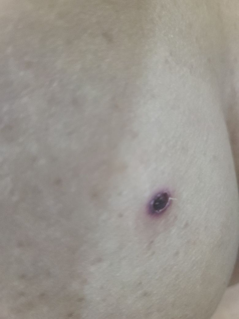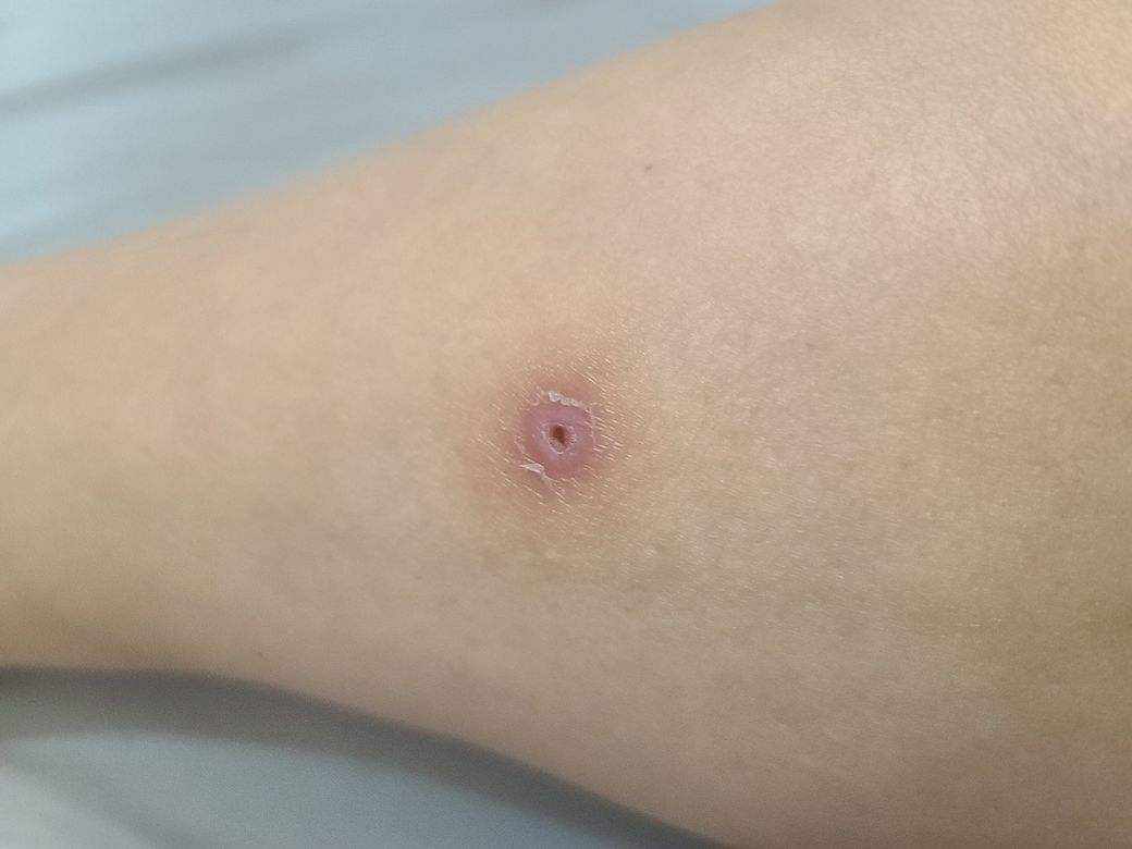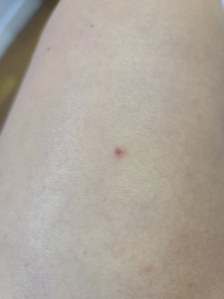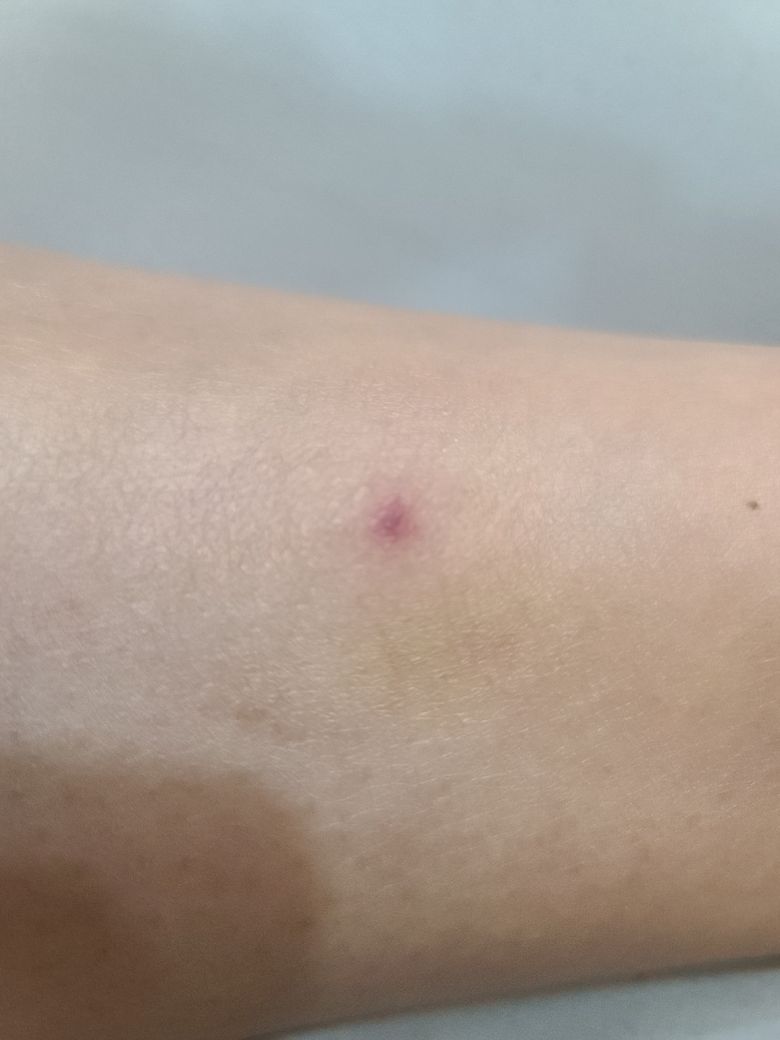 벌레 물린 자국일 가능성이 높습니다. 아마 가려우실 것 같구요. 항생제 연고를 좀 바르시고 가려우면 냉찜질 정도 하시면 되겠습니다.