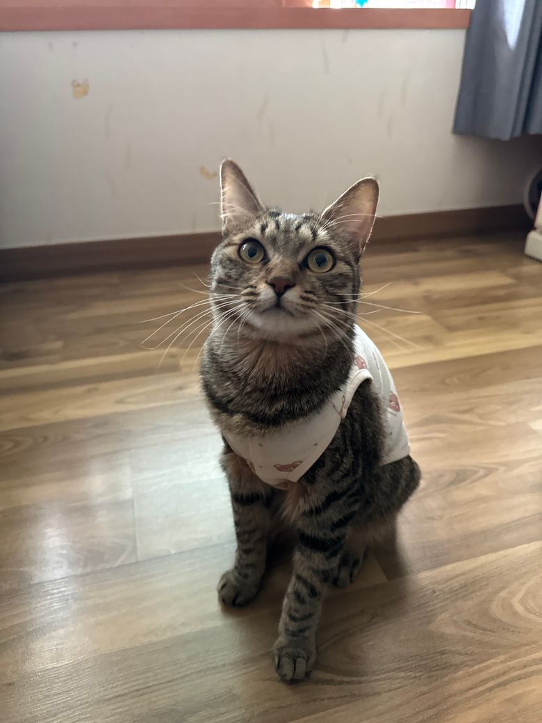 도메스틱 숏헤어이며 얼룩 고양이입니다. 중형묘고 단모종이며 체중은 3.5~5kg 정도로 적당한 크기입니다. 보통 수컷이 암컷보다 크며 꼬리는 중간 길이며 발이 둥글다는 특징이 있다고 합니다. 몸집이 잘 정비되어 있으며, 크기가 다양할지라도 키나 몸무게는 대개 비슷하다고 합니다.