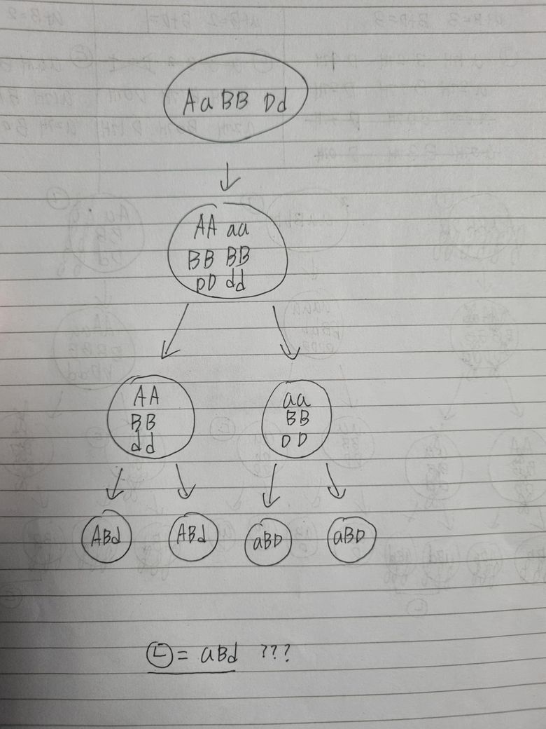 근데 감수 2분열 중기 세포는 AABBdd/aaBBDD인데 딸세포가 aBd가 나와요