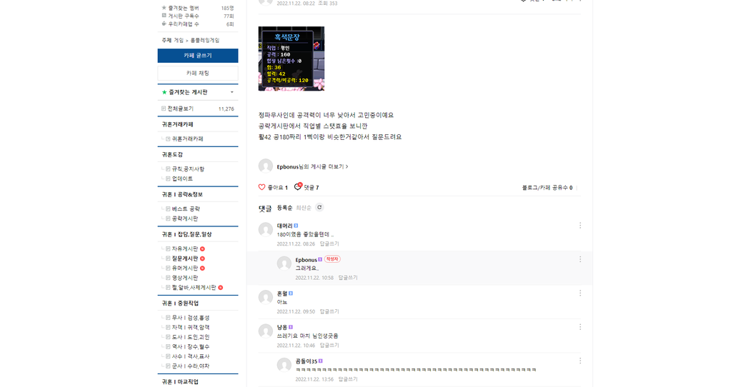 게임 도중 궁굼한 게 생겨 해당 게임을 주제로 다루는 카페 질문탭에 질문을 하나 올렸습니다