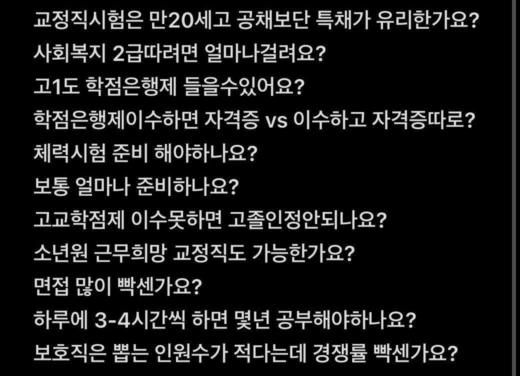 이제 고1되고 대학에 가고싶은 마음이 없어서 공무원을 알아보게 됐습니다. 고등학생때 공무원준비를 하고싶습니다. 공부는 못하는 편은 아니지만 잘하지도 못하는 정도입니다. 질문이 많아서 길어질것같아, 사진첨부 했습니다. 친절히 답해주시면 감사하겠습니다.