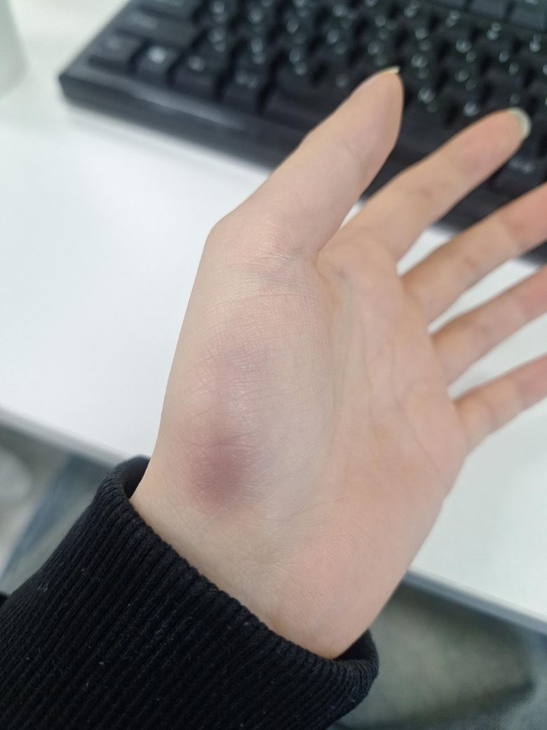 손바닥은 혈관이 촘촘하고 압박을 자주 받기 때문에, 강하게 쥐거나 무거운 물건을 들어 올릴 때도 작은 멍이 생길 수 있습니다.