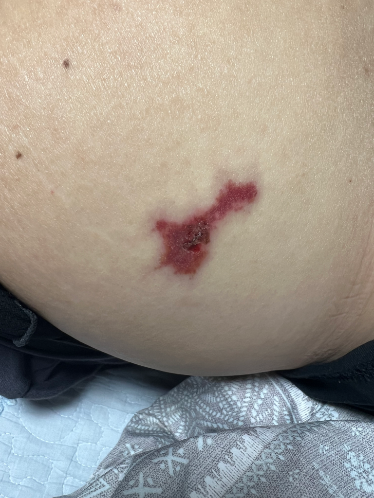 피부 괴사 생겼습니다. 대학병원 피부과 진료 보시는게 좋겠습니다. 문제가 생긴듯 합니다. 엉덩이 주사 맞은곳에서 치료할 상태가 아닙니다.