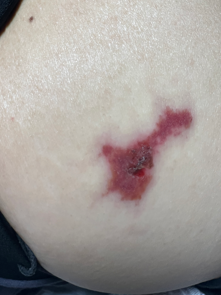 오늘이 8월 13일인데 멍의 크기가 조금 줄어들었지만 색이 더 진해졌고, 안으로 조금 패여 피가 난듯합니다.
