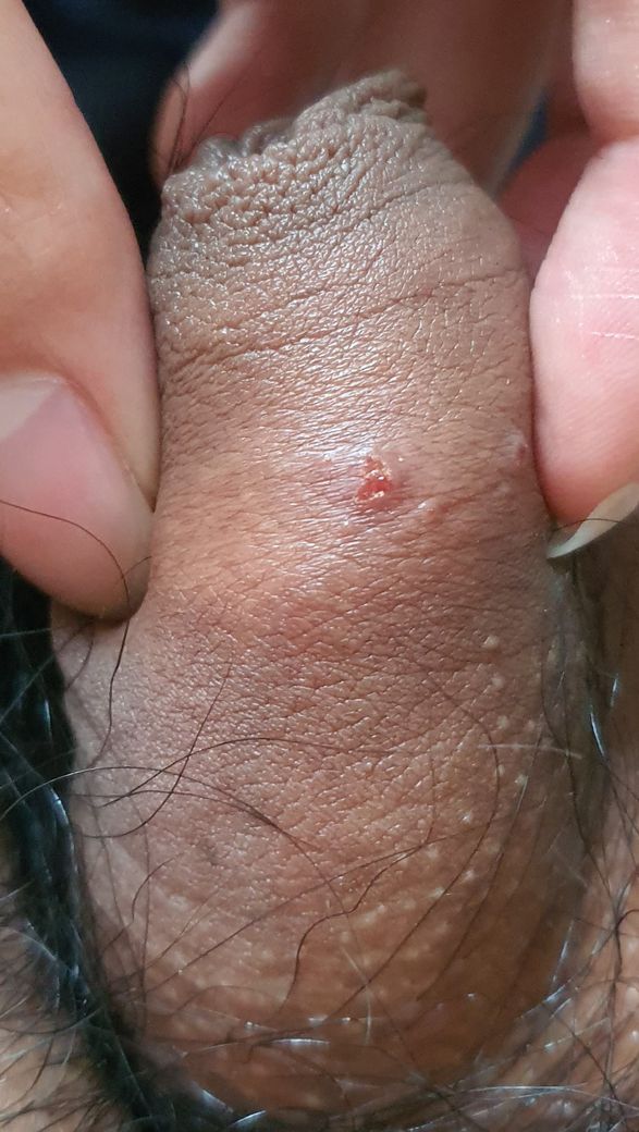 성관계 경험이 없다셨는데 사진 속 병변은 헤르페스가 생각됩니다. 비뇨기과를 방문하여 진료와 약처방을 받으시기 바랍니다.