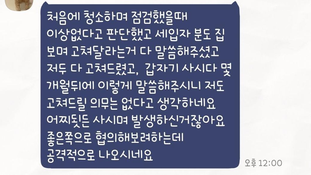 입주시 베란다문이 뻑뻑한걸 인지했으나 사진 ,동영상 촬영을 하지 못했습니다. 3윌 23일 입주후 6월초부터 베란다문이 이탈하여 6월 20일 동영상과함께 수리 요청했습니다. 처음에는 임대인이 수리해주겠다고 했고 임대인남편이 집에와서 확인후 업체선정해서 고쳐주겠다고했습니다. 2개월후인 오늘 갑자기 입주청소때 문제가 없었기때문에 고쳐주지못하겠다고 했습니다. 처음부터 문의 노후화는 인정했으나 저에게 원상복구를 시켜놓으라고 했다가 다시 안해도 된다고 했습니다. 카톡대화이기때문에 카톡증거는 있으나 전화증거는 없습니다.. 추후 임대인측이 제게 수리를 하는걸로 말을 바꿨을때 문제가 될까요? ㅠ 보증금 500만원에서 멋대로 수리비라고 제외하고 줄까봐요..