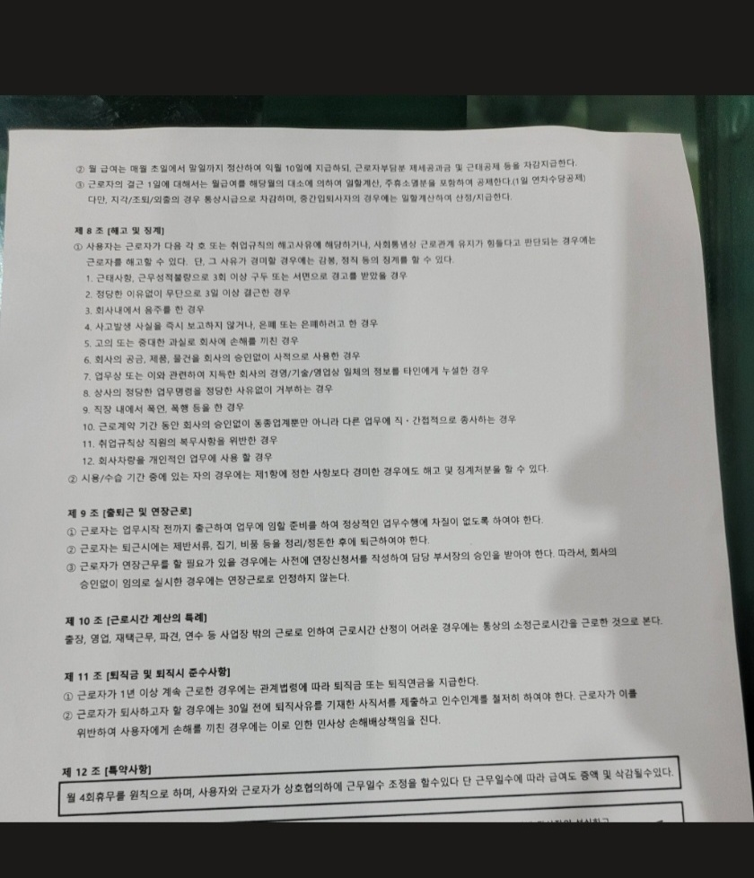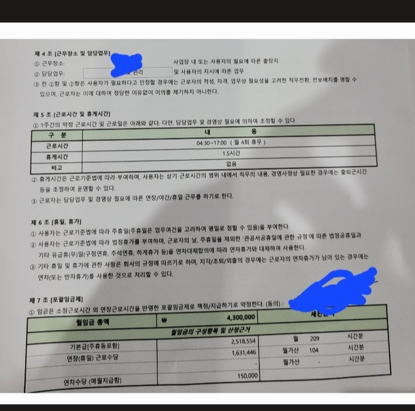 기존 계약서와는 다르게 주6일근무제에서 월 4회 휴무로 변경. 특약사항에 월 4회 휴무를 원칙으로 한다고 추가하여 계약서 작성 완료한 상태입니다.