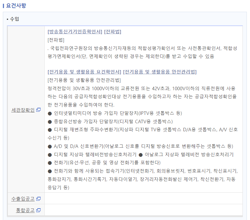 수입요건은 관련법 상 해당 되는 물품에 대하여 수입요건을 득하여야 합니다.