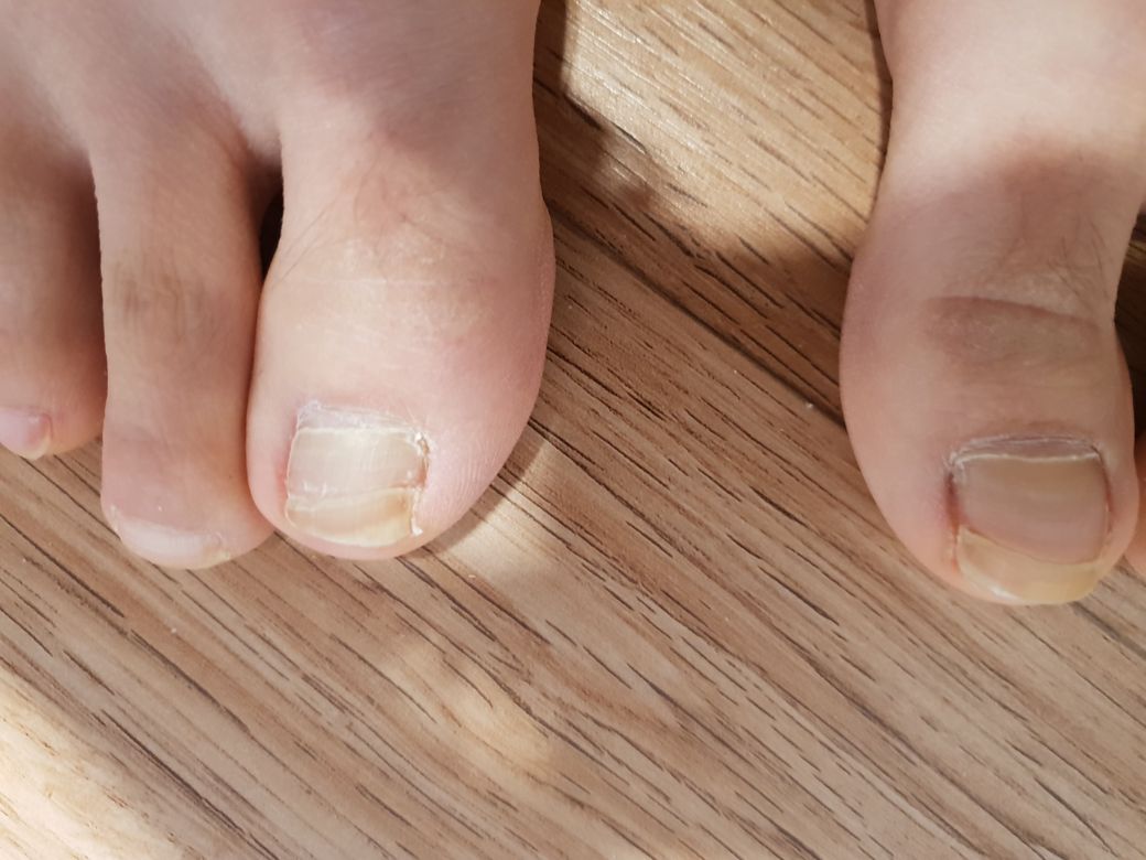 양쪽 엄지 발톱에 가로 줄로 깨져 있는데