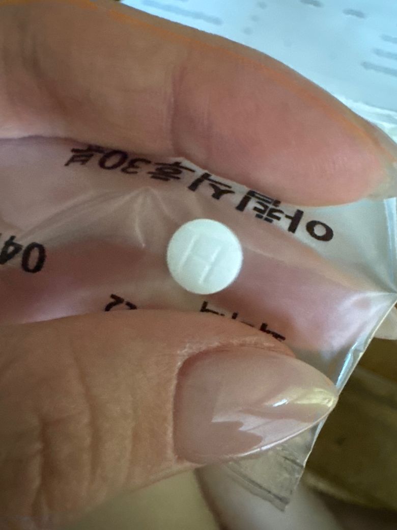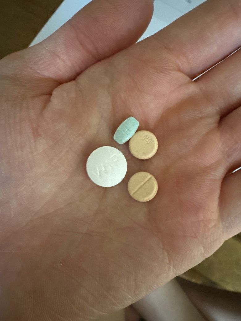 일단 아침저녁 동일하게 들어가는 흰색 원형 wip라고 적힌 알약이랑 H라고 적힌 흰색 원형 알약, H,A2 앞뒤로 적힌 민트색 둥근 직사각형 알약, 0.5라고 적혀있고 반 가를수 있는 선있는 살구색 원형 알약이에요!