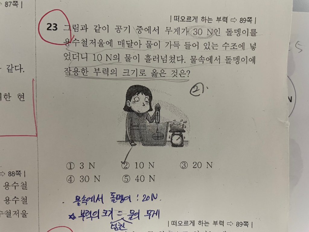 그 물을 재보니 10N이었다면, 부력이 물에 작용하였을테니 10N이 됩니다.