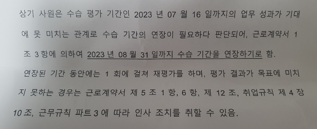 하지만 수습연장 계약서에는 마치 수습연장을 미리 확정하고 있는 것처럼 15일뒤 수습이 끝나는 날짜에 업무 성과가 기대에 못미치는 관계로 수습을 연장한다고 써있어요.