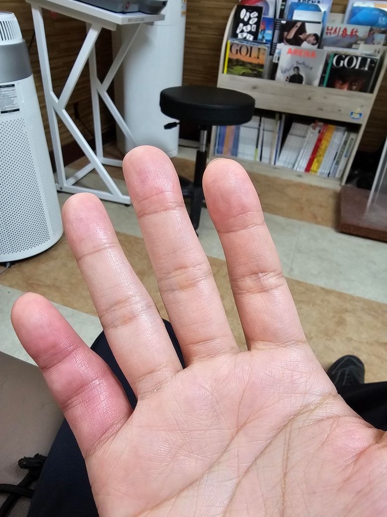 4월21일에 손가락 인대파열수술 했는데요.그 뒤로 계속 피부가 붉은게 안없어지네요.