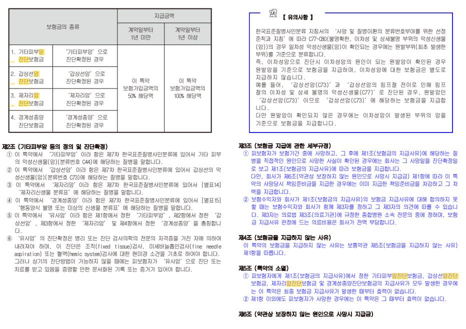 단, 기타피부암, 상피내암, 경계성종양은 가입금액의 20% 해당액 지급 (최초 1회한)