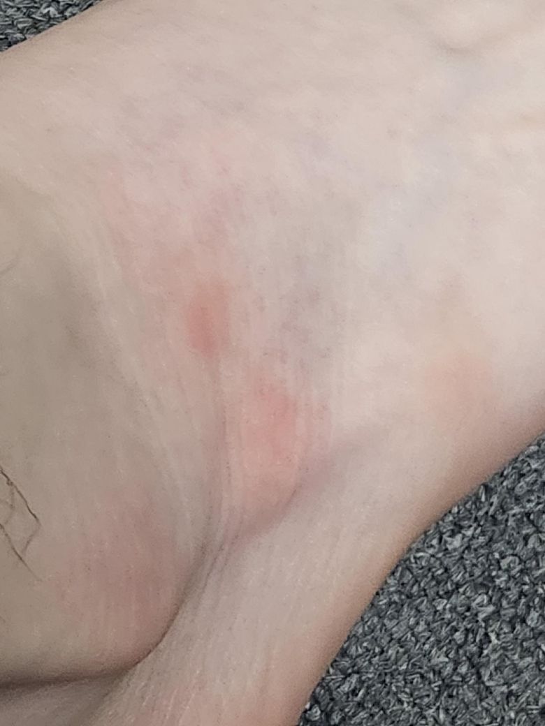사진의 비특잊거인 소견만으로는 구체적인 감별 및 진단을 내리기는 어렵습니다. 사진을 보았을 때에는 발진처럼 보이는 병변이 몇 개 보이는 정도의 평가를 내릴 수 있겠습니다. 벌레 물림에 의한 것일 수도 있고 무언가 접촉에 의하여서 알러지 반응이 일어난 것일 가능성도 고려해볼 수 있습니다. 일시적인 증상일 가능성이 있으므로 스테로이드 연고 등을 발라주며 조절해보시길 권고드리며, 시간이 경과하여도 차도가 없다면 그 때에는 피부과에 가보시는 것이 적절하겠습니다.