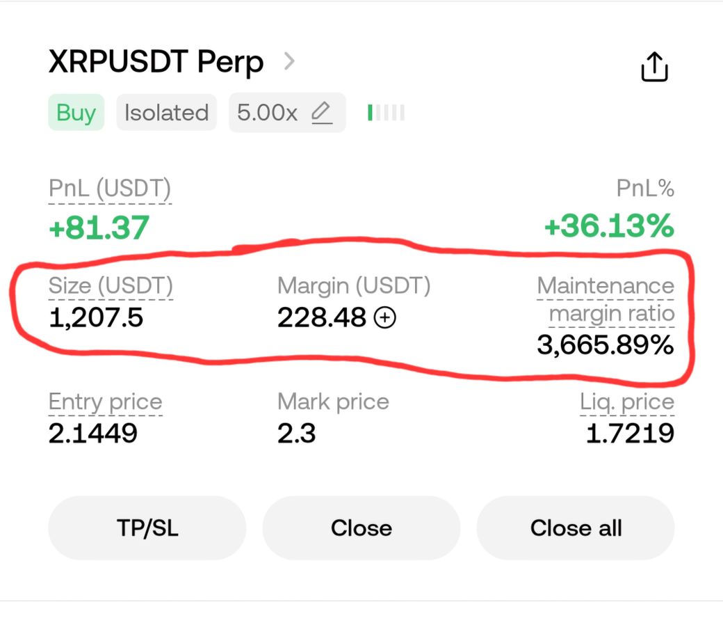 Margin 228.48usdt가 투자한 원금이고, mark price인 2.3이 청산가 입니다.