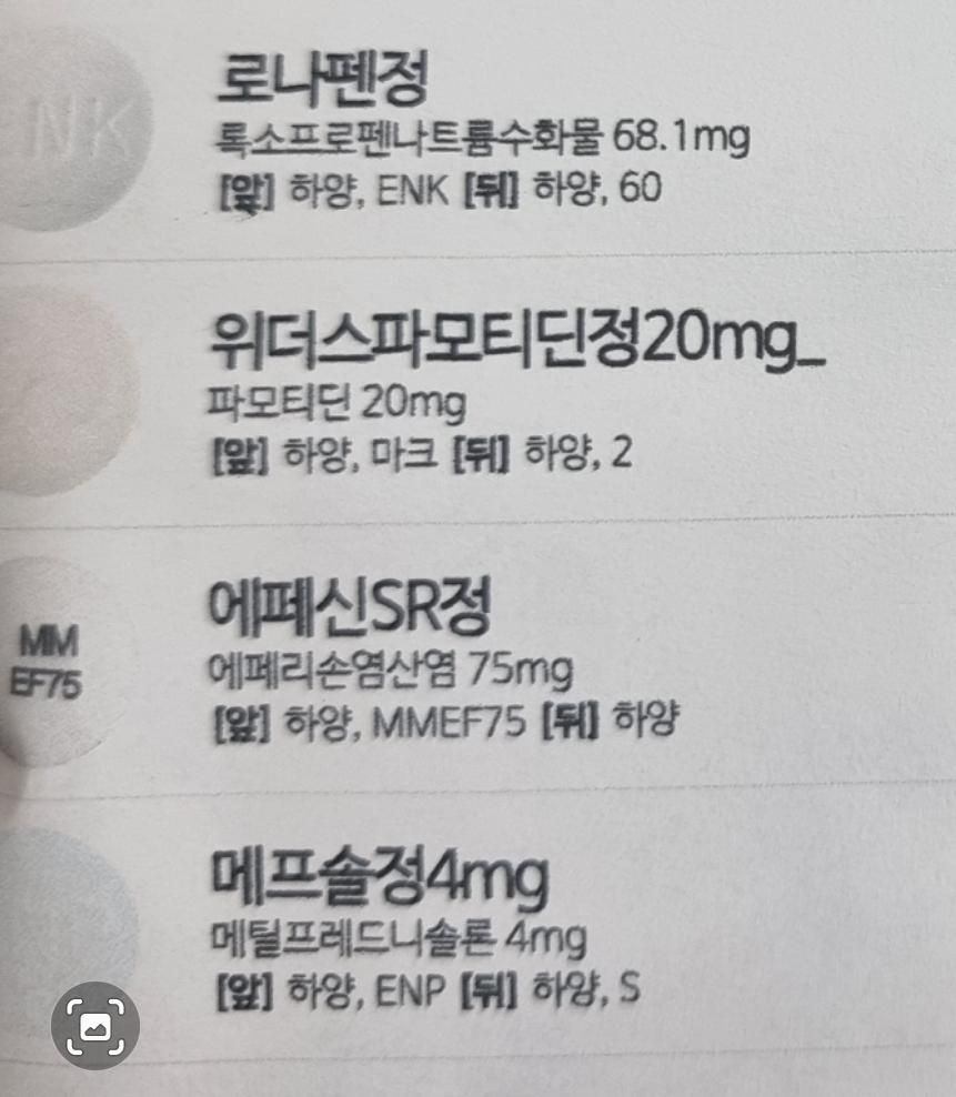 성분명은 약봉투에 약이름 아래 작게 써있는 이름이 성분명입니다. (록소펜, 파모티딘, 에페리손, 메틸프레드니솔론)