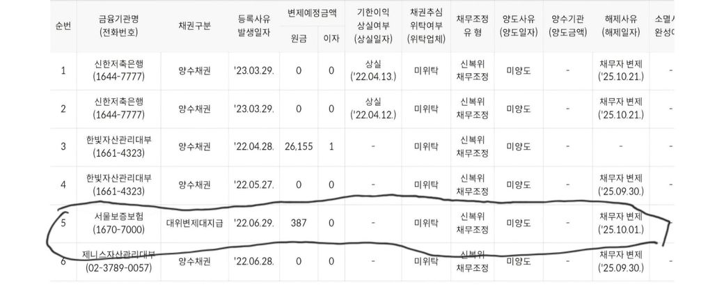 저번달에 다른채무들하고 서울보증보험꺼 완납하고 해제(채무자변제)로 되었는데요
