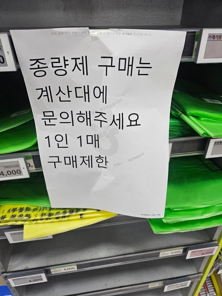 저희지역에는 20리터는 1인10매, 50리터는 1인5매까지 제한되었습니다.