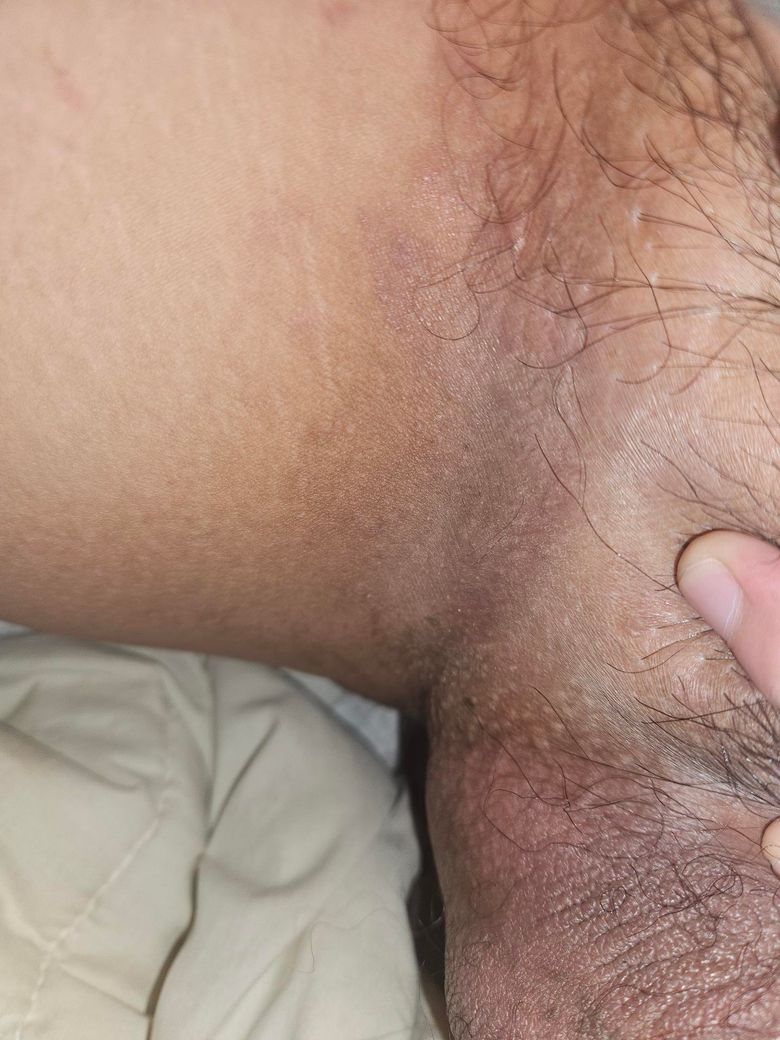 사진상 허벅지 안쪽 접히는 부위에 갈색 내지 암갈색 색소침착과 피부가 두꺼워진 소견이 보입니다. 비만이 있고 마찰이 반복되는 부위라는 점을 고려하면 단순 마찰성 색소침착 또는 초기 흑색가시세포증(acanthosis nigricans) 가능성이 있습니다. 급성 염증이나 진균 감염 소견은 뚜렷하지 않습니다.