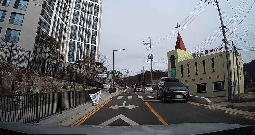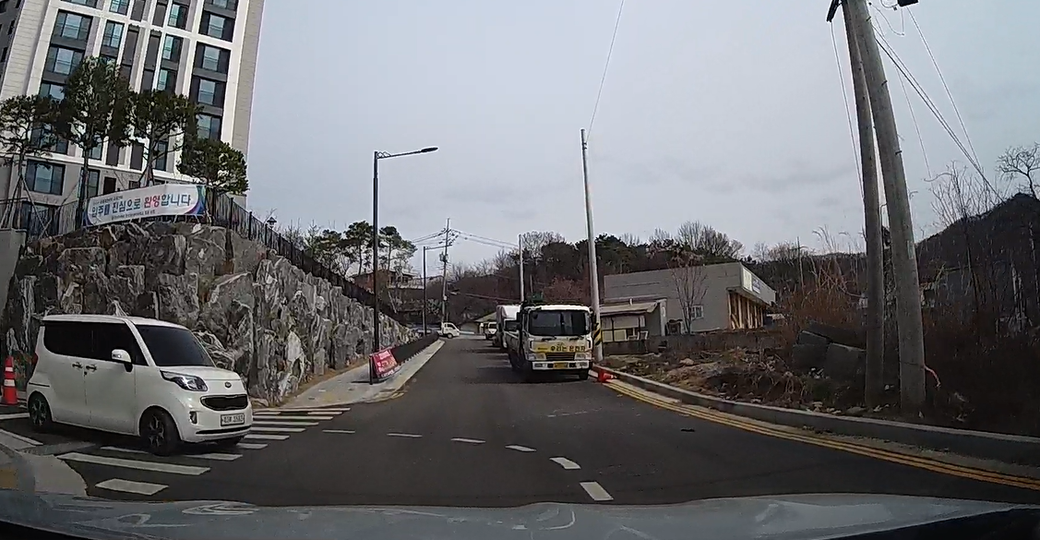 도로에 주차가 되어있는 길에서 주행중으로 중앙선 넘어 주행중이었고