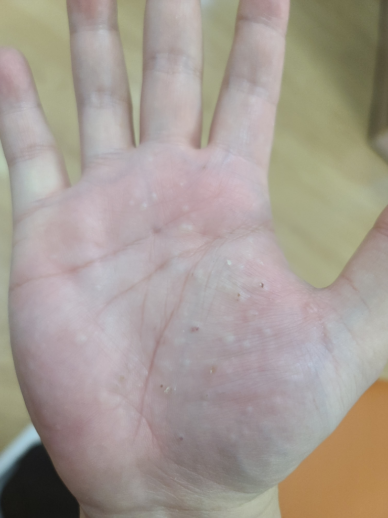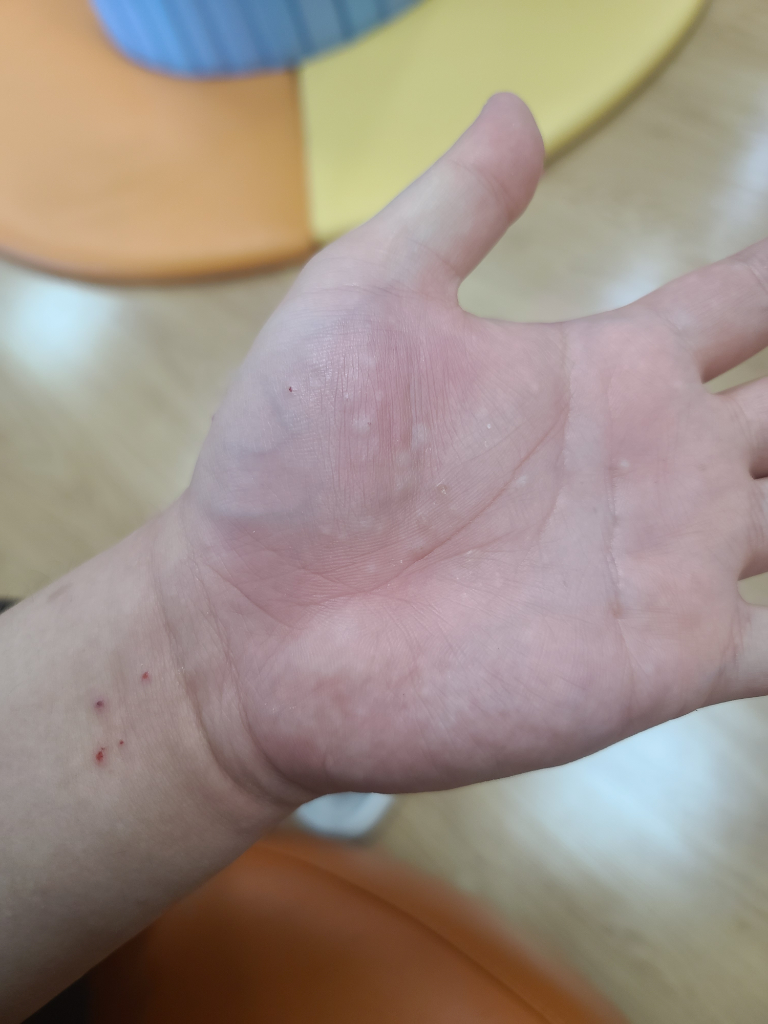 한포진이네요. 자극을 줄이면서 지켜보면 없어지기는 하지만 너무 가려워서 치료를 받는 것이 좋습니다. 피부과에 가셔서 스테로이드 연고 처방을 받아보시지요.