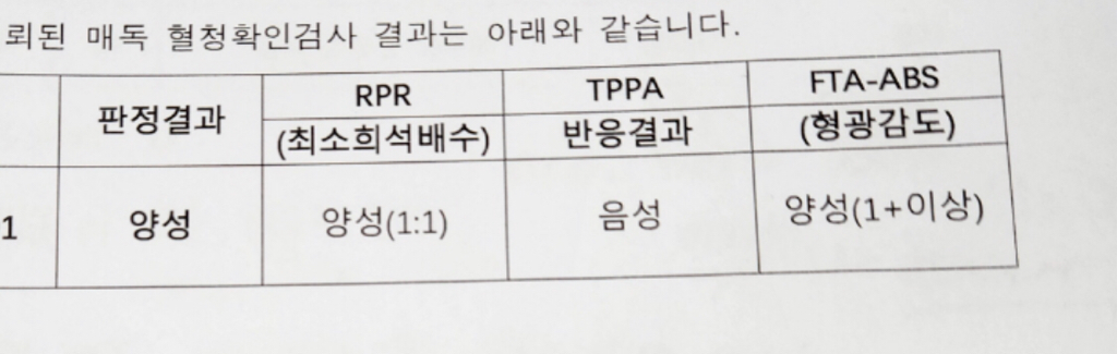 제공해 주신 검사 결과에 따르면, RPR(속성피블로바스 반응)은 양성이지만 TPPA(트레포네마 팔리덤 입자응집시험)는 음성으로 나와 있습니다. RPR은 매독의 비특이적 항체를 검출하는 시험으로, 다른 조건에서도 양성 반응이 나올 수 있습니다. TPPA는 매독을 일으키는 균에 대한 특이적 항체를 검출하는 시험입니다.