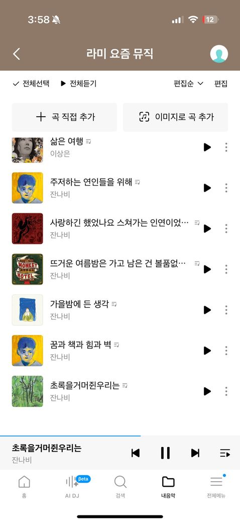 저는 플레이리스트는 없지만 비오는 날 듣기 좋은 노래로 래원의 잠 못 드는 밤이 좋은 것 같습니다 비와 관련있는 노래는 아닌거같지만 비트가 뭔가 비오는 날 듣기 좋은 비트인거같습니다