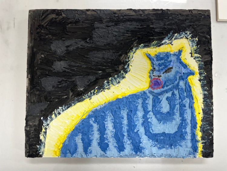 이중섭의 황소를 모티브로 하여 검은 배경에 두텁게 칠한 푸른 황소로 어려움(어둠)속에서도 빛나는 황소가 되라는 의미를 담아 작품을 제작했습니다. 사용 기법은 마띠에르 기법입니다.