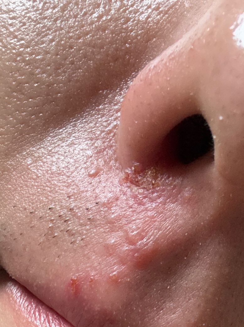첫 번째 사진으로 미루어 면역력 저하로 인한 단순포진의 가능성이 생각되므로 목 감기 치료와 함께 별도로 아시클로버 연고를 발라보시기 바랍니다.