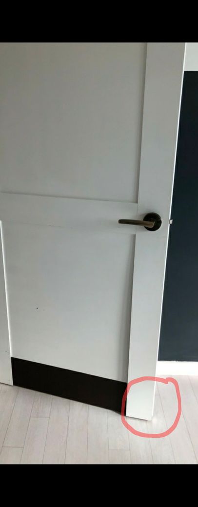 첨부한 사진의 원 표시의 나무 합판이 오랜 세월로 인해 떠있는 상태여서 문 닫는 부분에 걸려 제대로 닫힐 때도 있고 닫히지 않을 때도 있는 상태입니다. 합판을 부분적으로 갈아 닫히게 할 수 있었으나 생활에 불편함이 없어 열어 놓고 사용하였으며 이 부분을 중대하자라고 주장 중에 있습니다.