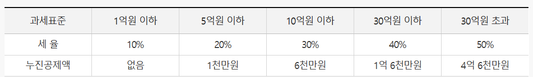 증여세 과세표준에 따른 세율은 다음과 같습니다.