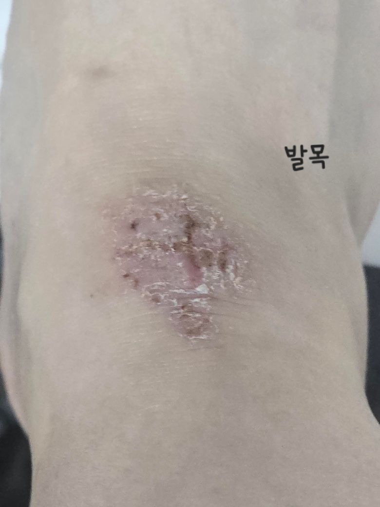 발목과 뒤꿈치의 증상은 비슷하게 생겼습니다. 습진이라 더마픽스 연고를 처방받아서 바르고 있습니다. 균이 들어가지 않게 해야하나요? 어떻게 해야하나요? 직업상 실외에서 일하는편입니다. 주 5일 9시간이요.