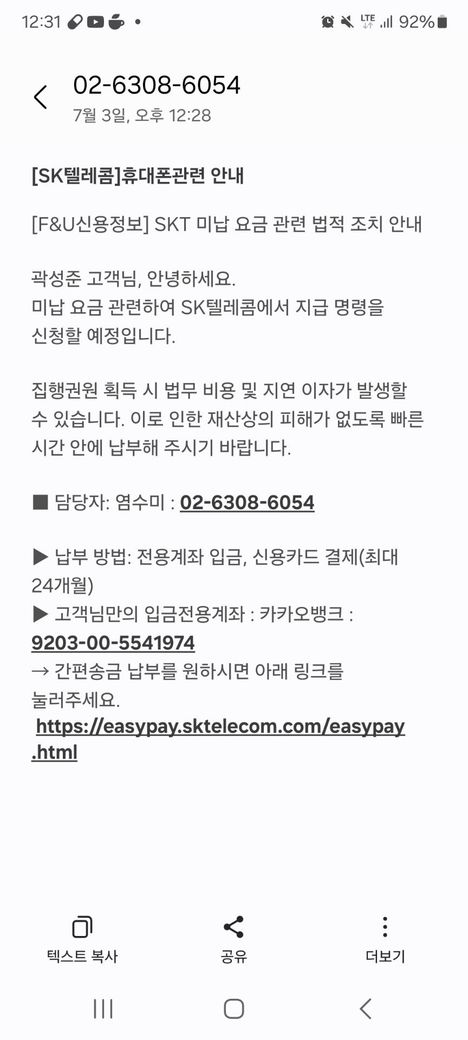 위와 같은 문자가 단순히 겁주기용이라고 보기는 어렵고, 미리 연락해서 월요일에 납부하겠다고 소통하는 것을 권해드립니다.