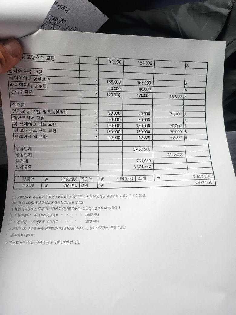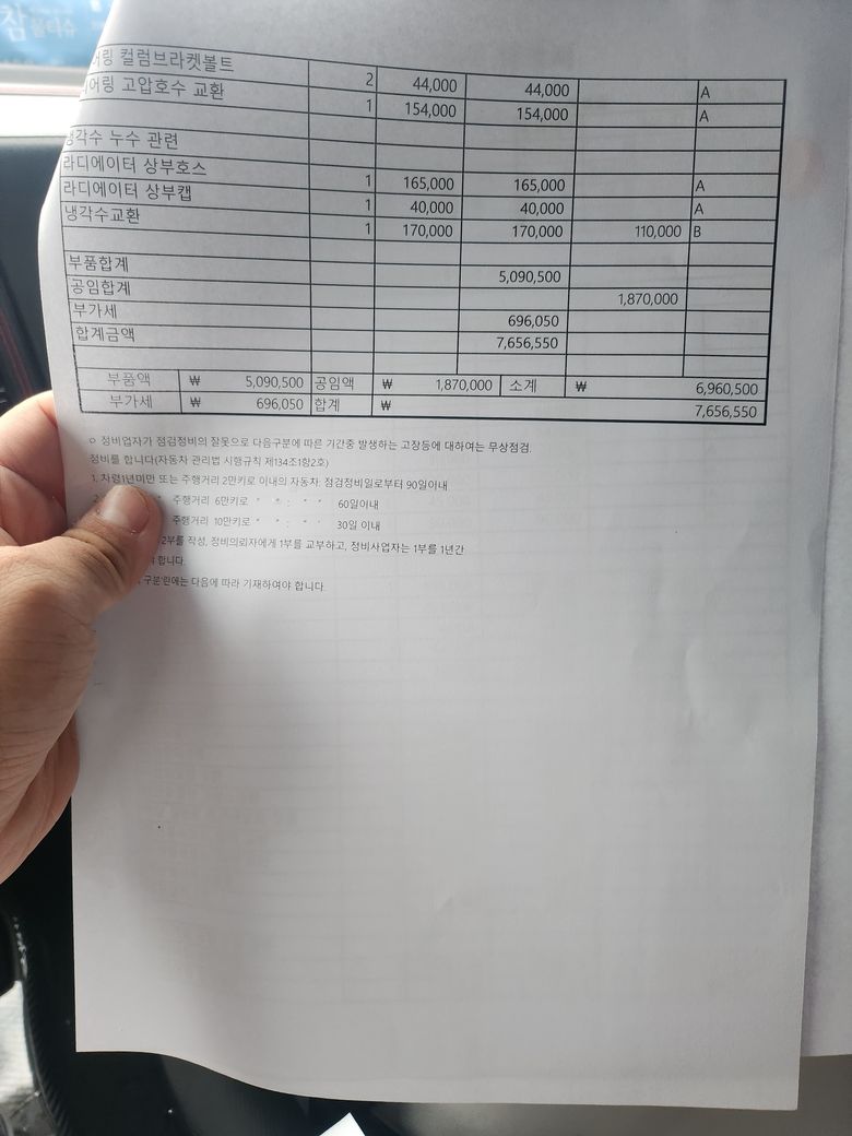 엔진 누유 부분 및 오일펜 누유 라지에이터 등 교환으로 750만원 견적 받음 수리 기한 부품 수급2주 수리 1주 3주 판정 받음