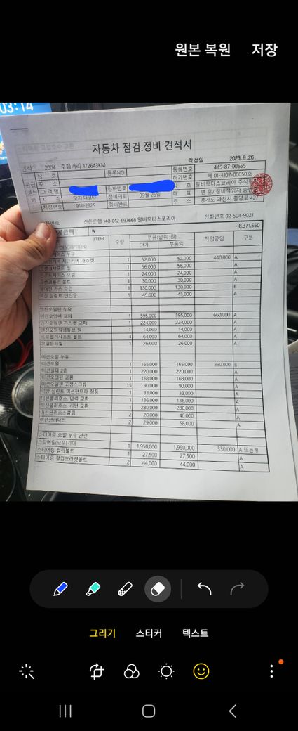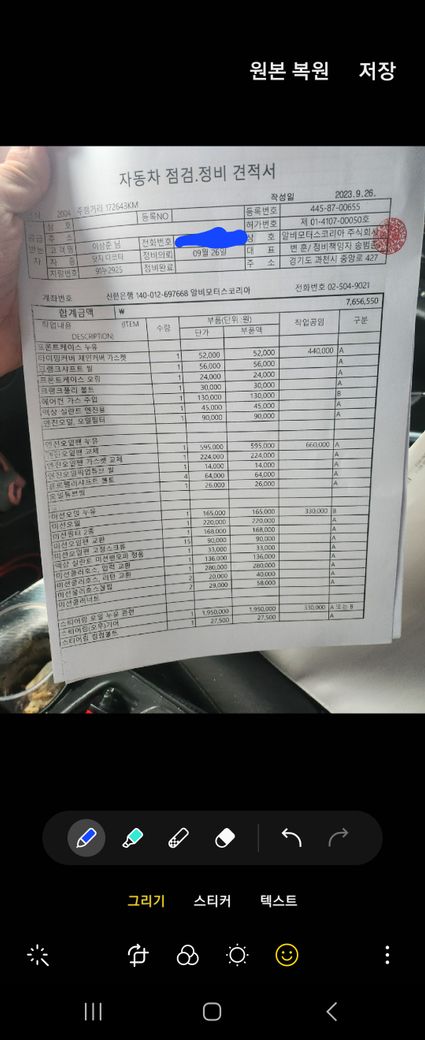 사진에 견적서 남겼습니다 정비 부분 및 LPG가스 교체 등 입니다 소모품 추가 전 후 비교 견적 서도 올렸습니다 진짜 악질중에 악질인거 같습니다 꼭 형사 처벌까지 하고 싶습니다 ㅠㅠ 민사 소송 자문 구하면서 소장 넣고 기다리고 있는데요 혹시 제가 패소 할 수 있나요.... 대차한 차량이 2004년식 이며 정비 하는곳이 많지 않아 22일 경기 광주시에 공업사에서 진단1회 민사 소송 전화 상담후 네이버 카페 도움으로 25일에 예약 26일에 정밀 진단 후 자동차 부품 750만원 때 및 lPG 노후 및가스 누출 로 교체 진단 받고총견적 1000만원 정도 입니다 정밀 검사 받고 이차량은 소모품 조차 재때 교환 안한 차량이라 소모품100 포함 하면 1100때입니다 소송 걸면 소모품