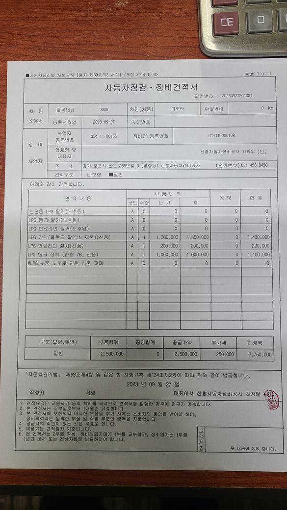 10. 차량 엔진룸 누유로 인하여 수리 받을라면 LPG가스 튜닝 받은거 원상 복구 해놓고 수리가 가능하다 하여 견적 보니 탈거 60 입니다 하지만 LPG가스 통 부식 및 가스 샘으로 교체 해야된다 합니다