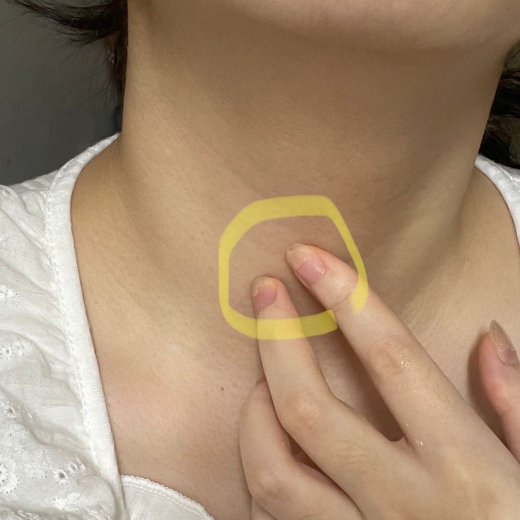 현재로서는 사진만으로 판단이 어렵습니다. 해당부위에 갑상선 샘이 있으므로 비대나 결절로 인해 불편감을 느끼는 것은 아닌지 이비인후과에 먼저 내원하시어 진료를 받아보시는 것이 좋겠습니다.