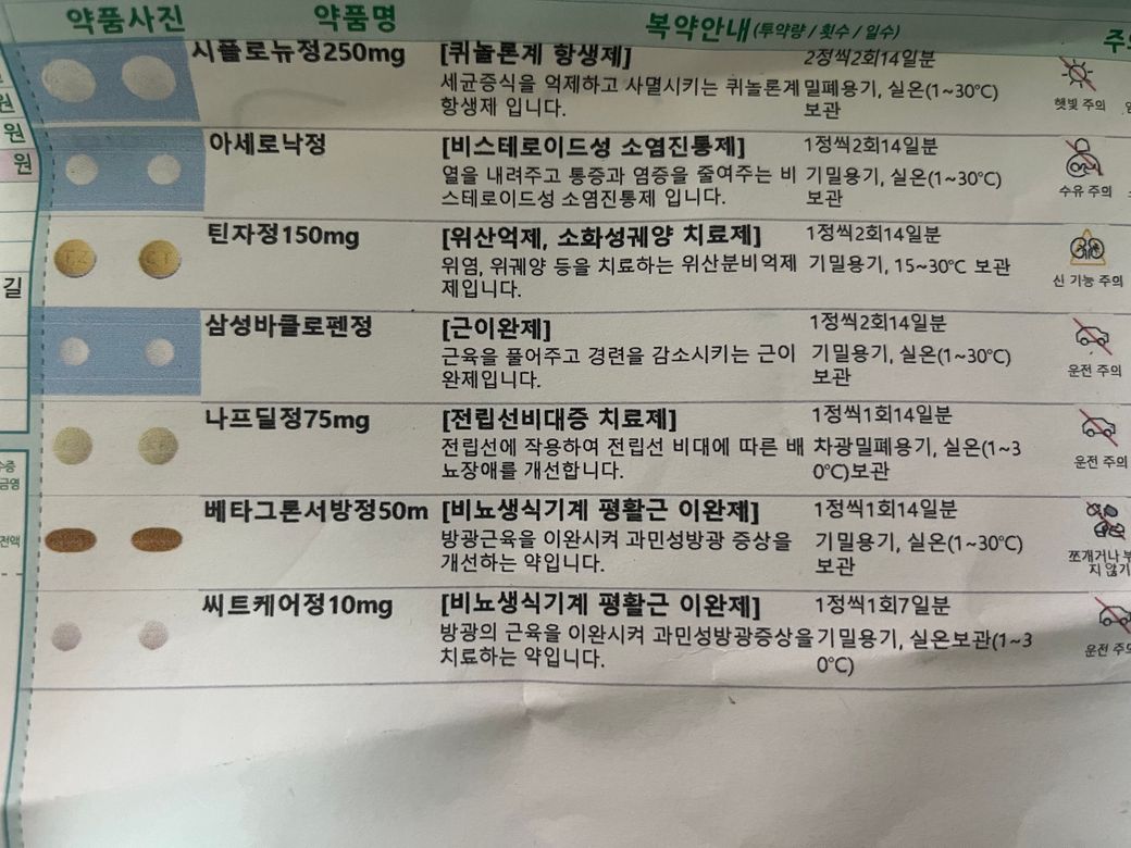 처방받은 약물 중 배뇨 곤란(소변 흐름 끊김 등)을 유발할 가능성이 있는 약물은 베타그론서방정(메토프롤롤) 또는 나프딘정(프레가발린)인데, 이는 각각 베타 차단제와 신경계 작용 약물로 방광 기능에 영향을 줄 수 있습니다. 그러나 위에서 언급했 듯이 전립선염이라는 기저 질환이 원인일 수도 있으므로, 담당 의사와 상의 없이 약물 복용을 중단하지 말아야 합니다. 특히 언급한 약물들, 메토프롤롤과 프레가발린은 갑작스러운 중단 시 반동 효과나 금단 증상으로 건강에 좋지않은 영향을 줄 수 있어요.