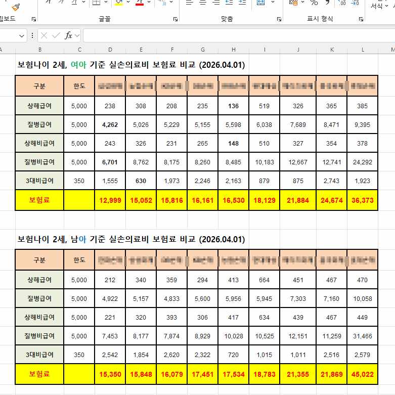 어린아이라 그런가.. 보험료 차이가 많이 나네요.