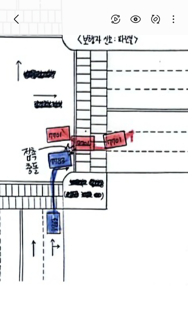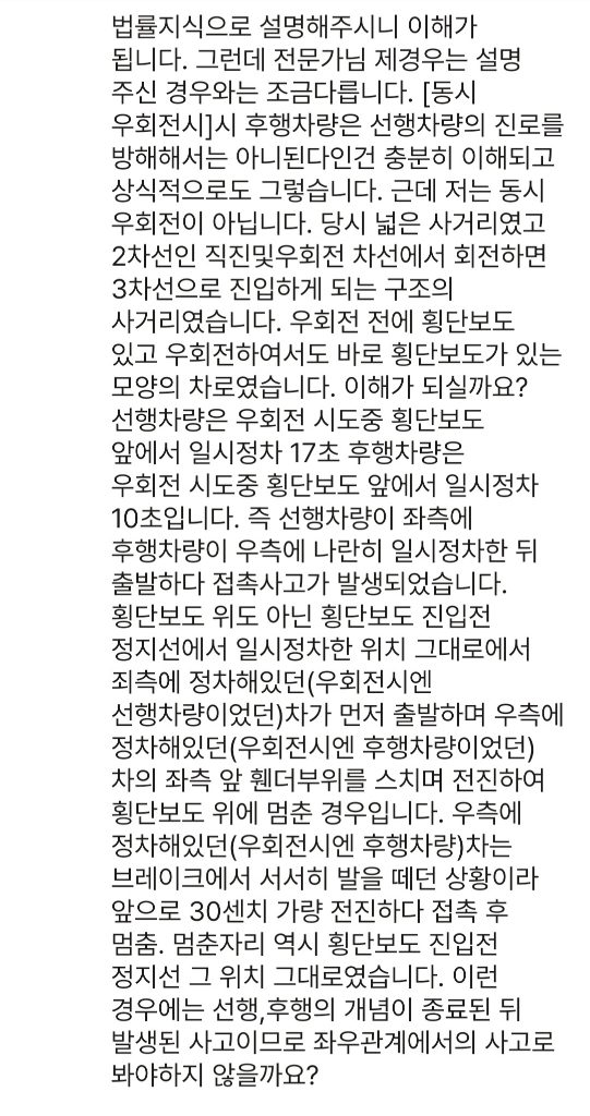 1. 이 경우 전후사고가 아닌 좌우사고로 봐야하지 않을까요? 1번차가 선행하여 대 우회전했고, 2번차는 후행하여 1번차가 대 우회전후 우측에 넓게 비워 놓은 공간으로 우회전했음. 이때까진 전후관계이나 사고 없었고 두 차량 모두 횡단보도 진입전 정지선에서 각각 17초, 10초간 일시 정차하였다가 다시 출발하다 발생된 접촉사고이기에 이건 좌우사고 아닐까요?