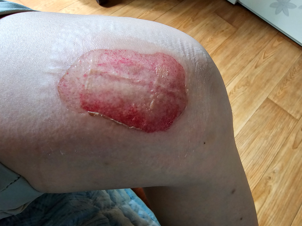 이미 물집이 벗겨진 상태로 보이고 최소 2도 이상의 화상입니다. 진물이 흘러나올테니 집에서 소독하시려거든 연고를 골고루 바르고 메디폼을 붙여주시고 하루 최소 2회 이상 상처를 새로 소독해주시기 바랍니다.