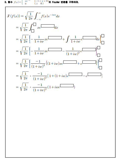 공업수학 함수 f(x)에 대한 Fourier 변환을 구하는 문제에서 빈칸에 들어갈 내용이 궁금합니다.