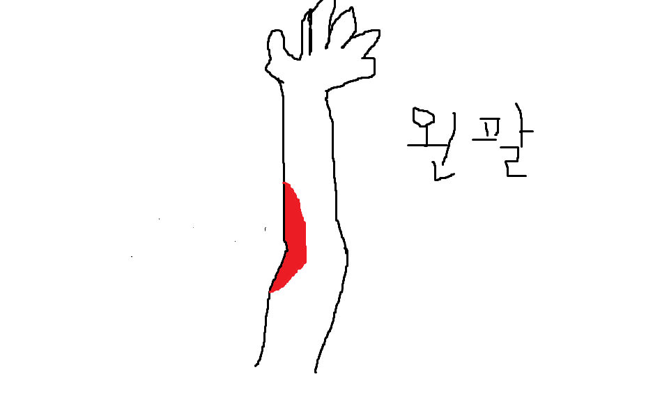 빨간색으로 표시된곳이 팔을 접을떄 아픕니다. 왼쪽팔 전완근쪽과.접히는쪽과 살짝위가 아픈데요.바벨컬 운동을 하다가 다첫습니다. 10개월 넘어 가구요.