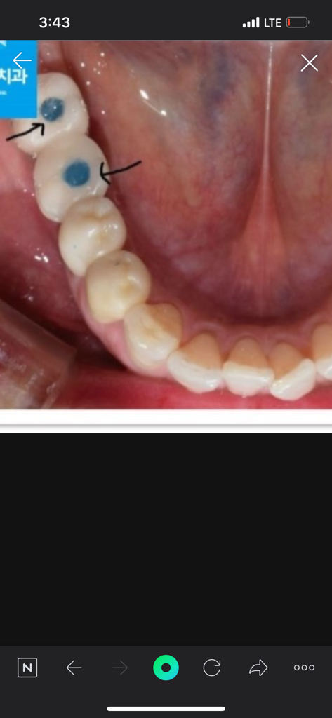 현재 파란색인 부분은 아마 레진 등을 통해서 수정할 것으로 보입니다. 다만 이는 오히려 시멘트 타입보다 유지 관리가 좋습니다. 해당 공간의 hole을 통해서 임플란트 머리와 뿌리 부분을 분리할 수 있는데, 추후 임플란트 머리가 부서지거나 문제가 생기더라도 위쪽 보철물만 교체할 수 있어 장점이 있습니다.