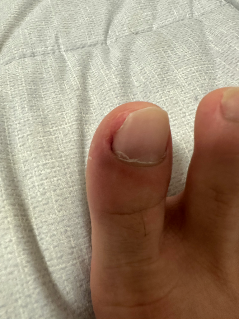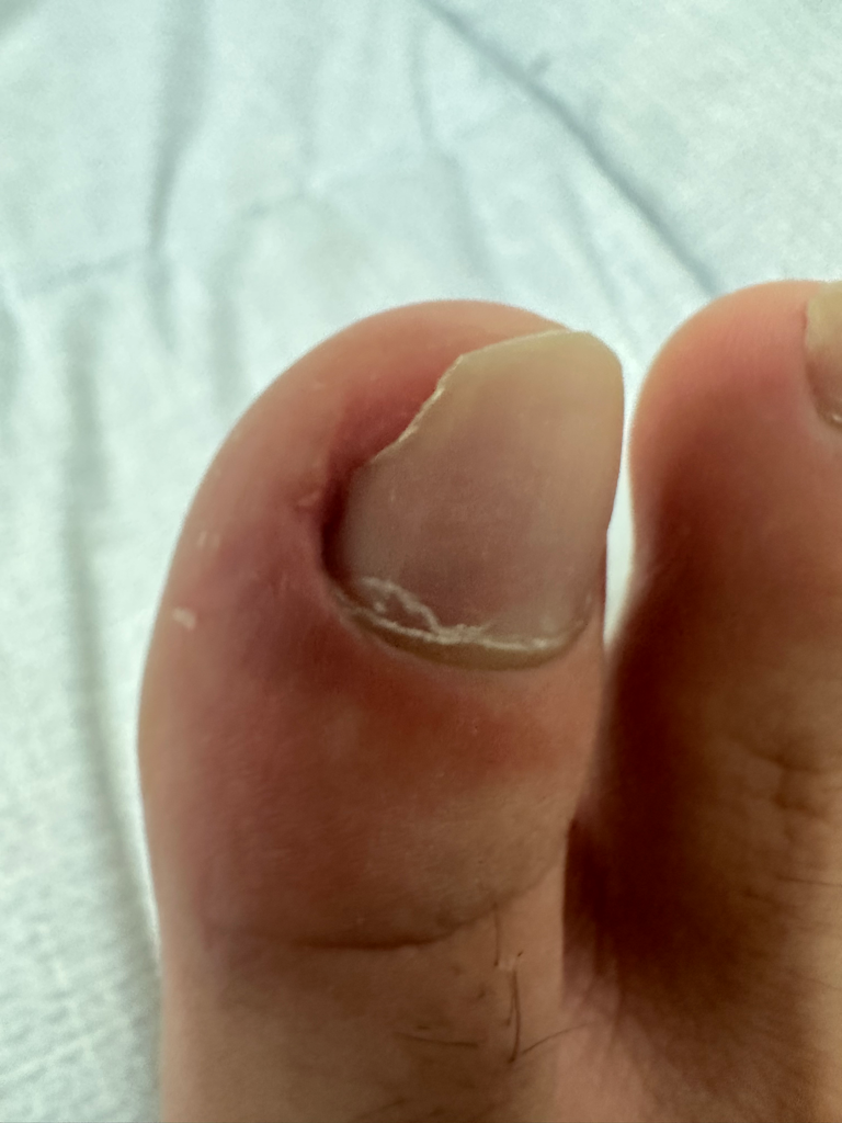 내향성발톱의 가능성이 높아 보입니다. 현재 사진의 상태를 고려하였을 때 보존적 치료(약물, 항생제)를 우선적으로 생각할 수 있습니다. 만약 보존적 치료로도 치료가 안되는 경우 시술로 치료로 진행하시길 권해드립니다.