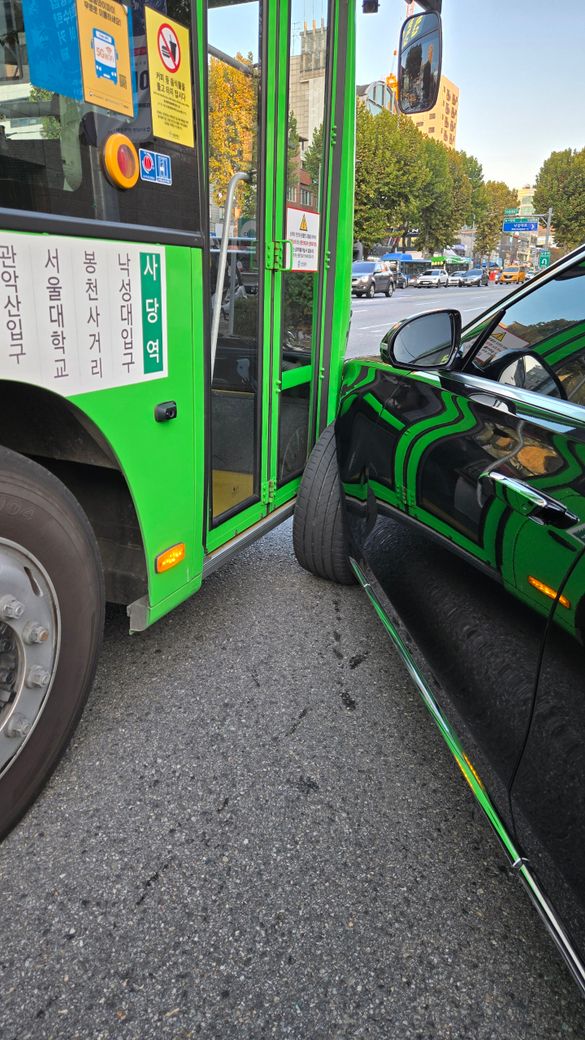 안녕하세요 지난주말 낙성대역에서 접촉사고가 나었습니다. 우회전하며 양옆을 봤을 때 지나가도 되겠다 싶어서 우회전했는데 직진버스가 갑자기 뒤에서 받았습니다.