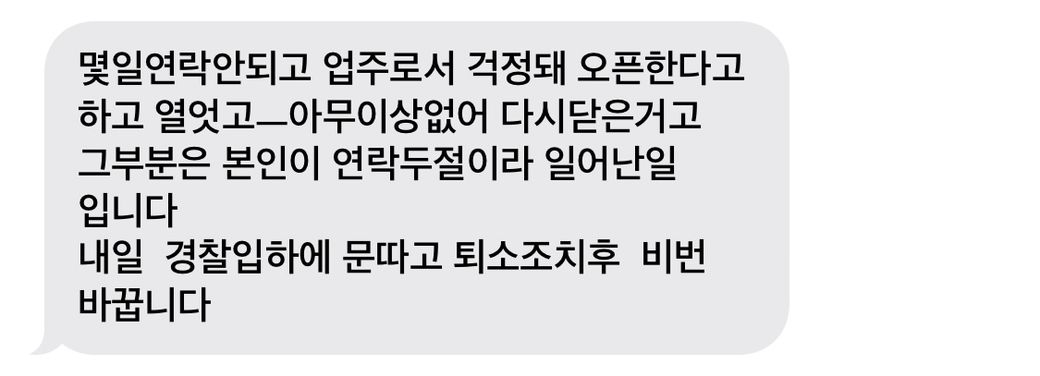 문자 내용은 월세 못 내고 일로 바빴을 때 자고 있던 와중에 문을 열었고 걱정이 되었다는 말도 안 되는 소리를 했습니다.홈캠 아니면 모를 뻔 했고 마스터키 하나로 문을 쉽게 열 수 있다는 걸 알았으니 그냥 모두 다 무서운 상태입니다.
