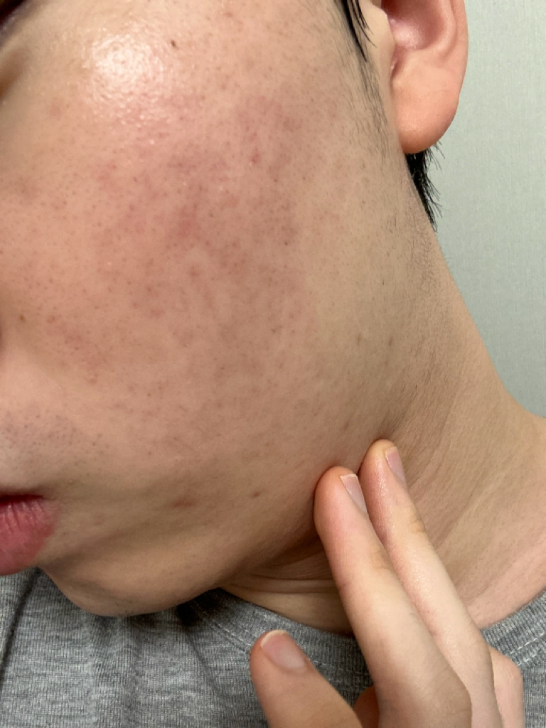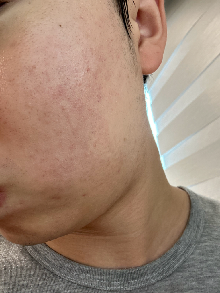 하지만 얼굴 온 곳곳에 여드름이 있던 곳에는 색소침착이 있고, 그 외 얼굴 전체에 붉은자국? 붉은기가 있습니다. 피부 표면 바로 밑에 은은하게 붉은색 큰 점들이 있는 것 같습니다